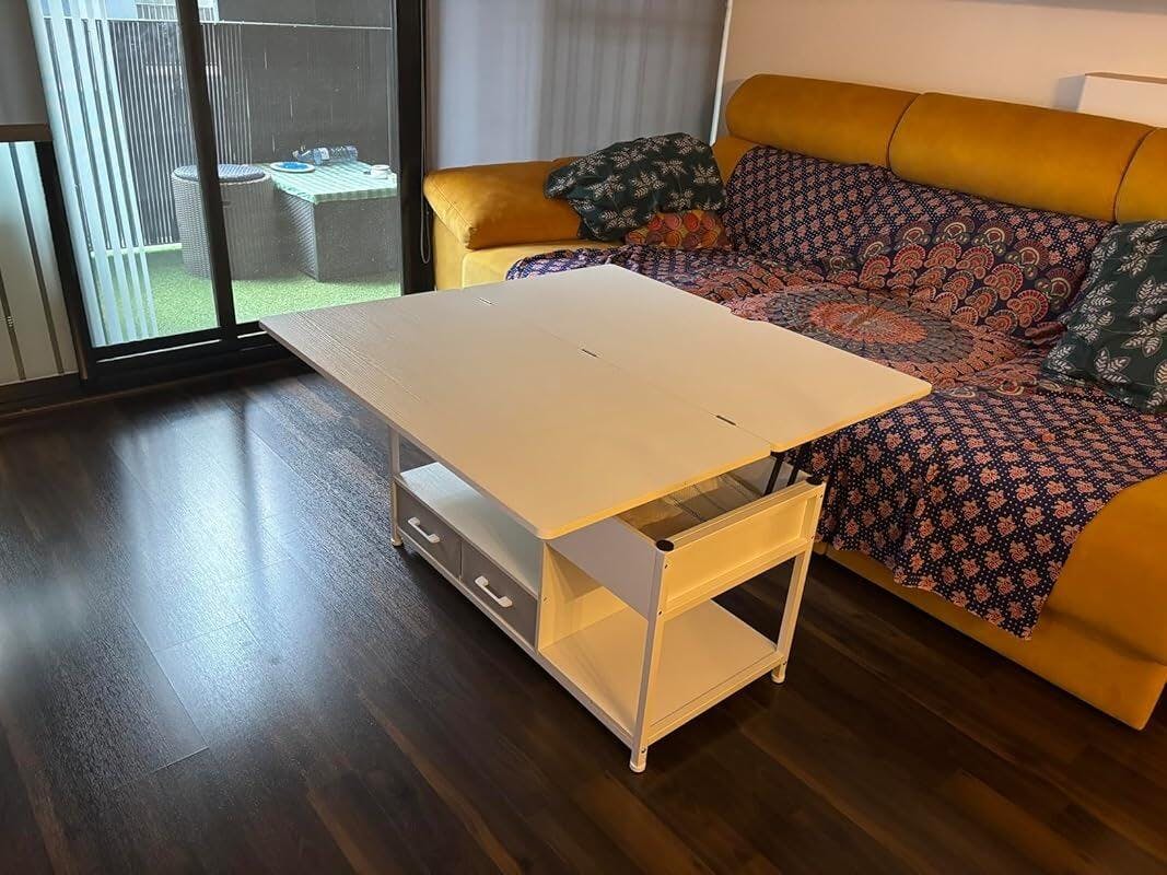 Für kleine Räume Der Couchtisch mit einer Hebefläche kann mühelos aufgeklappt werden. Normalerweise ist der Tisch 50 x 100 x 50 cm ideal für kleine Räume. Im ausgeklappten Zustand wird der Tisch 100 x 100 x 67 cm groß. Dieser multifunktionale 3-in-1 Couchtisch kann Ihre verschiedenen Bedürfnisse im Alltag perfekt erfüllen. 2 Farben (grau und braun) zur Auswahl, geeignet für mehrere Wohnstile. Der Kaffeetisch lässt sich unbedingt in die bestehende Einrichtung integrieren Vielseitig Einsetzbar Wenn die 2 Tischplatten gleichzeitig angehoben werden, verwandelt sich der elegante Kaffeetisch in zwei unabhängige Arbeitsplätze, an denen zwei Personen gleichzeitig arbeiten können, ohne sich gegenseitig zu stören. Und Sie können die größere Tischplatte auch um 180° ausklappen, dann wird er ein Esstisch für 6-8 Personen. Hinweis: Heben Sie die kleinere Platte an, bevor Sie die größere Platte ausklappen, damit die Platte nicht beschädigt wird Ausreichend Stauraum Dieser Couchtisch bietet viel Stauraum. Unter der Tischplatte befindet sich versteckter Stauraum. Dank der 2 Stoff-Schubladen können Sie Fernbedienung, Gläser, Controller und andere Dinge unterbringen und vor Staub schützen. Darunter befinden sich zwei offene Regale, auf denen Sie Aufbewahrungsboxen, Dekorationen oder Bücher platzieren können Solide und Langlebig Der Couchtisch ist aus hochwertiger MDF-Platte und einem robusten Metall-Hebemechanismus gefertigt, so werden die sanftere Höhenverstellung und hohe Belastbarkeit garantiert. Außerdem befindet sich an der Seite der wasserdichten und haltbaren Tischplatte ein Rillengriff, der das Öffnen des Tisches erleichtert und Fingerverletzungen verhindert Schnelle Montage Mithilfe der gekennzeichneten Teile und der mitgelieferten ausführlichen Anleitung ist die Montage einfach. Falls Sie einen beschädigten Couchtisch erhalten oder Zubehör fehlt, können Sie uns jederzeit kontaktieren und wir werden Ihnen gerne sofort helfen