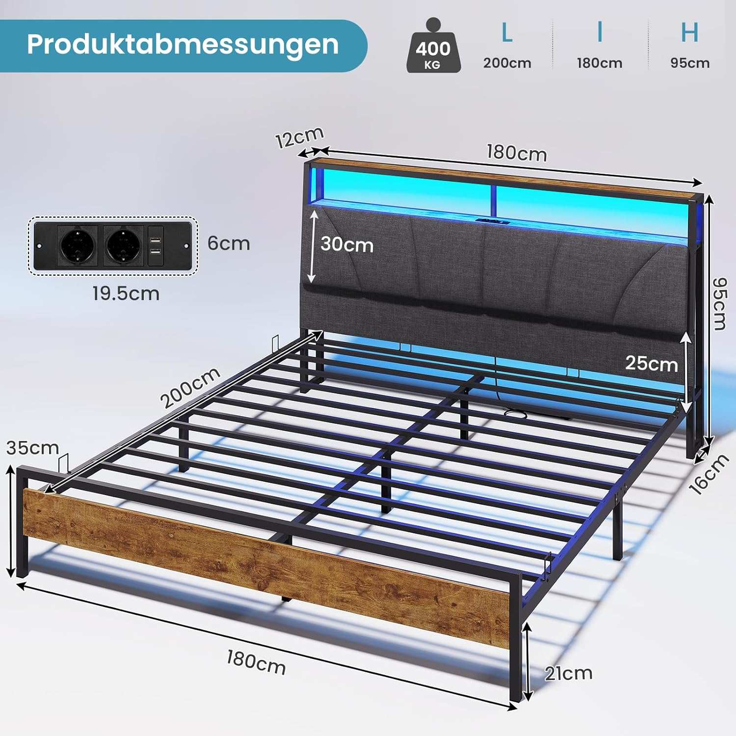 Bett mit Lattenrost aus Metall, Bettgestell mit LED Beleuchtung, Kopfteil & Ladestation, Braun+Grau