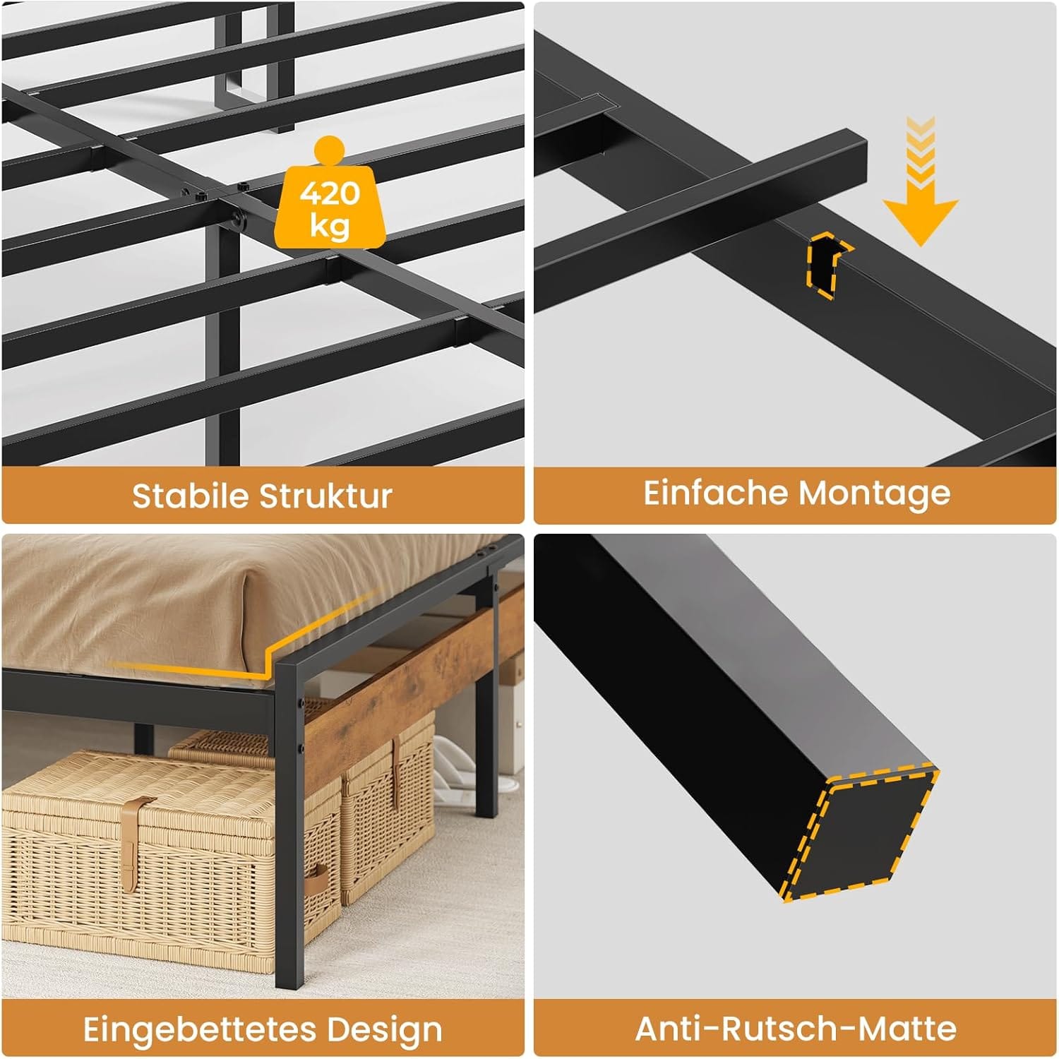Kopfteil mit Stauraum und Ladestation Das Bettgestell verfügt über ein Kopfteil mit einer eingebauten Ladestation. 3 USB-Anschlüsse und 1 Typ-C-Anschluss ermöglichen das Aufladen elektrischer Geräte in greifbarer Nähe. Zudem bietet das Kopfteil mit dem 2-stöckigen Regal und dem versteckten Fach genug Platz für Zeitschriften, Handy, Wecker und andere tägliche Gegenstände Metallbett mit multifunktionaler LED-Lichtleiste Das Doppelbett mit Kopfteil ist mit LED-Beleuchtung ausgestattet. Per Fernbedienung oder APP sind die Farben (über 6000 Farben auf APP), Helligkeit und Modi dimmbar. Darüber hinaus verfügt der Lichtstreifen über Musikmodus, Timing-Funktion sowie benutzerdefinierten Modus. Im Musikmodus verändert sich der LED-Streifen mit der Umgebungsmusik farblich, um eine romantische Atmosphäre zu schaffen Bettrahmen mit viel Stauraum Mit einer Bodenfreiheit von 30 cm bietet der Bettrahmen zusätzlichen Stauraum für Aufbewahrungsboxen und -taschen, Koffer und andere Gegenstände, die nicht häufig verwendet werden, um Ihr Schlafzimmer organisiert und aufgeräumt zu halten Solide & Stabil Das Bettgestell wird von Metallfüßen und einer zusätzlichen Mittelstange gestützt und garantiert somit eine hervorragende Stabilität und Langlebigkeit. Mit einer Belastbarkeit von bis zu 420 kg ist das Bett mit Lattenrost ideal für den täglichen Gebrauch, ohne Wackeln und lästige Geräusche Geräuscharm & einfache Montage Das präzise gearbeitete Metallbett wurde mehrfach getestet, um sicherzustellen, dass es auch nach längerer Nutzung noch stabil genug ist und keine störenden Geräusche verursacht. Alle nummerierten Einzelteile, das benötigte Werkzeug sowie eine ausführliche Aufbauanleitung sind im Lieferumfang enthalten. Mithilfe der Anleitung kann der Bettrahmen im Handumdrehen aufgebaut werden. Bei Fragen können Sie sich jederzeit an uns wenden