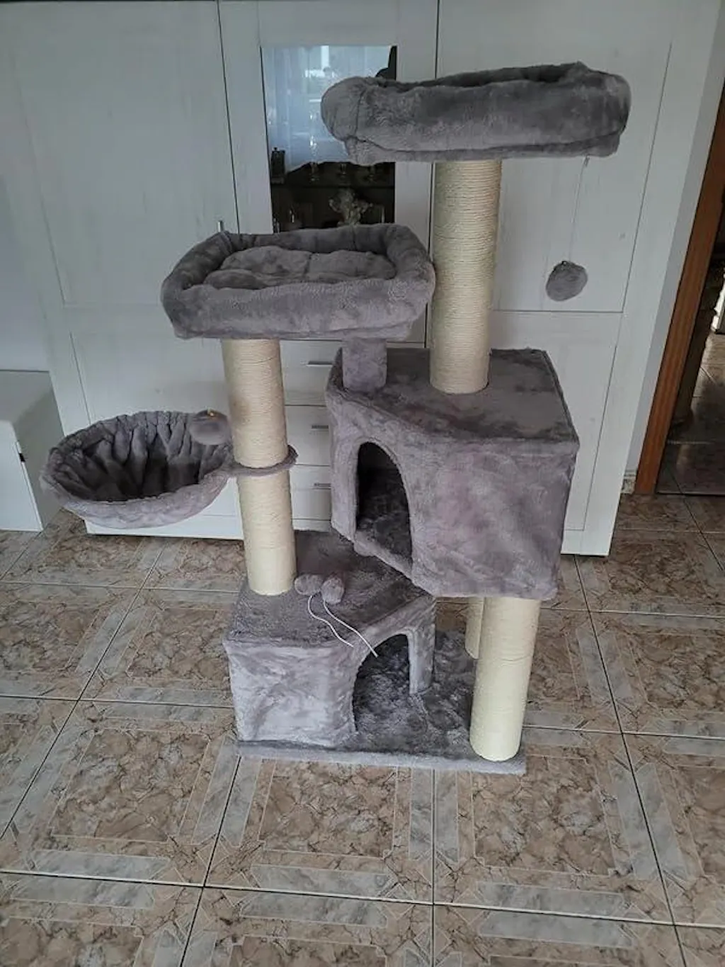 Komfortzone für Ihre Katze Die vortreffliche Ausstattung dieses Katzenbaumes 2 Aussichtsplattformen, mit 2 Höhlen und Plüschbällen mit Glocken, Ob gemütlich oder verspielt, der Kratzbaum findet bei jeder Katzenlaune vollen Einsatz. Kratzbaum trifft für große Katzen, Kätzchen, erwachsene und behinderte Katzen... Optimale Krallenpflege mit voll umwickelten Sisalstämmen Noch dicker als zuvor, sorgen auch die Sisalstämme für höchste Stabilität. Sisal Full Wrapped Sisal Pillar sind langlebiger. Die widerstandsfähigen Sisalstämme des Katzenspielturms ermöglichen die nötige Krallenpflege und sorgen dafür, dass Ihre Möbel verschont bleiben. Stabilität und Sicherheit an erster Stelle Das Kletterparadies wird von stabilen Sisalstämmen sowie einer verstärkten Bodenplatte getragen. Selbst bei aktiven Kletter-Künstlern sicher und steht stabil. Anti-Kipp-Beschläge sind im Lieferumfang für mehr Sicherheit enthalten. Premium-Plüsch für maximalen Komfort Im Vergleich zum Plüschgehalt anderer Kratzbäume weisen Kratzbäume einen höheren Plüschgehalt auf. Bringen Sie Ihren kleinen Tiger zum Schnurren! Das obere Katzenbett ist sehr groß und komfortabel. Einfache Montage Detaillierte Anleitung und Werkzeuge sind im Lieferumfang enthalten. Wenn Sie Fragen haben, können Sie sich gerne an uns wenden.