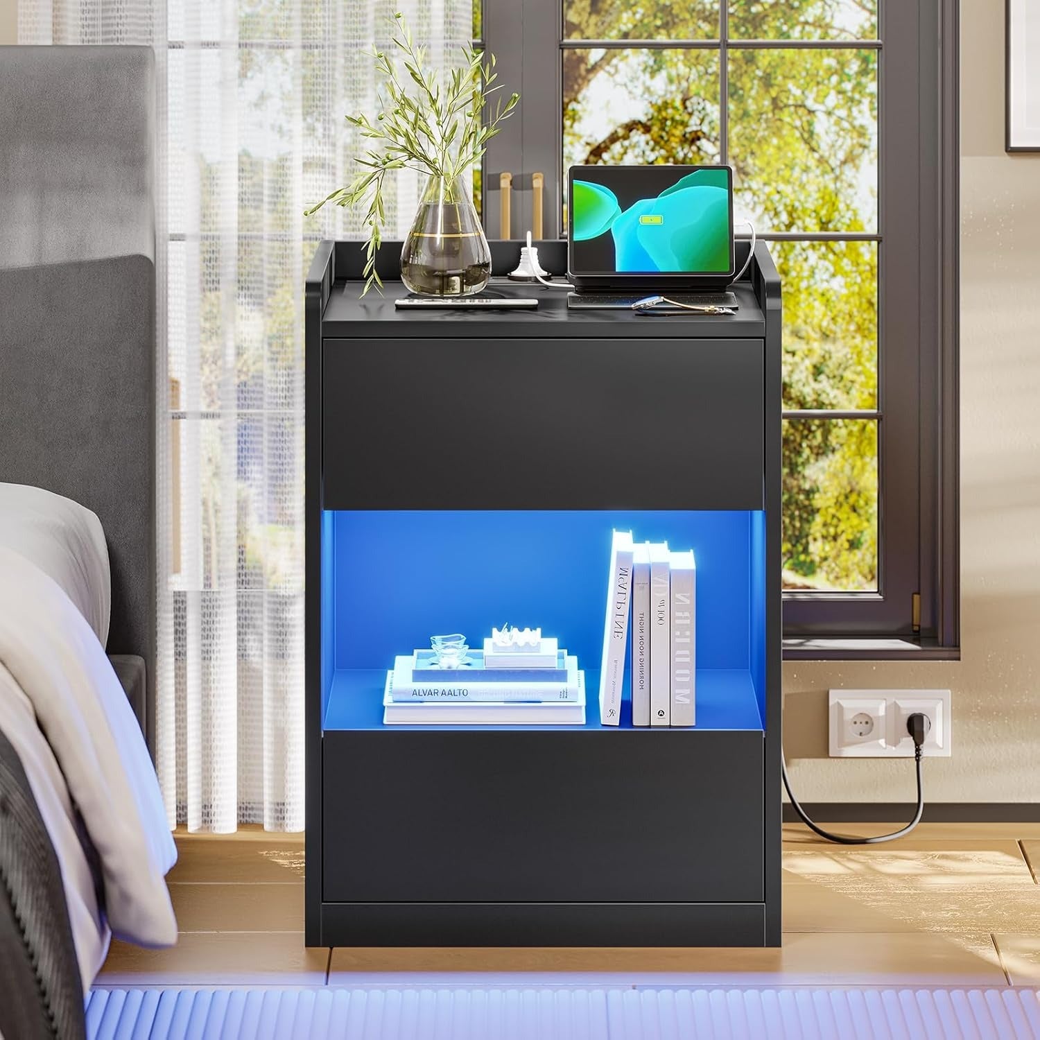 LED Nachttisch mit Ladestation, 2 Schubladen und 1 Fach Beistelltisch, für Schlafzimmer, Wohnzimmer 40x35x60cm