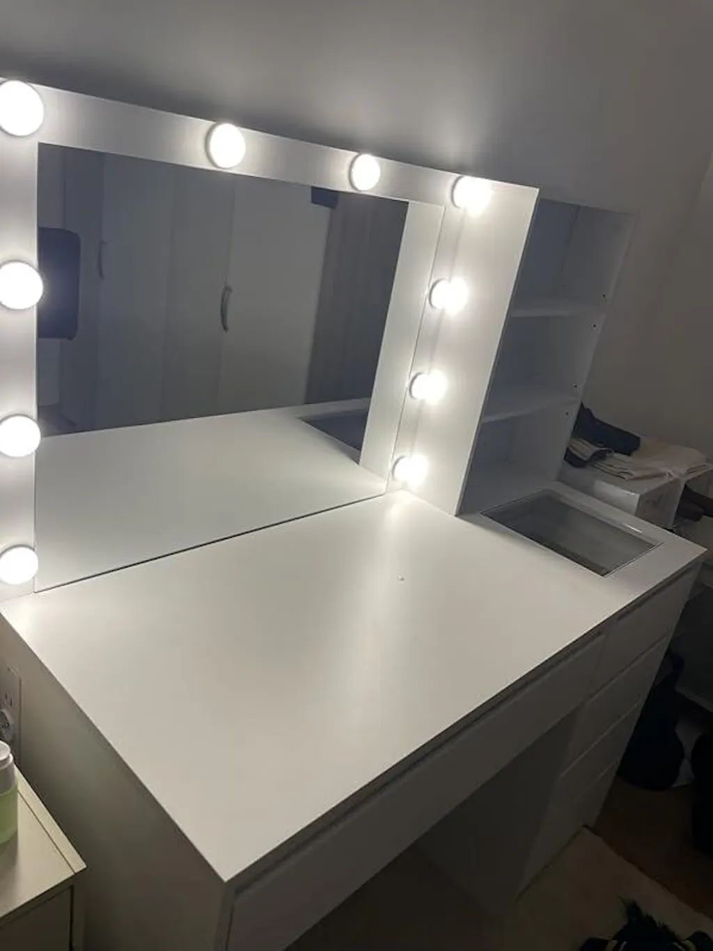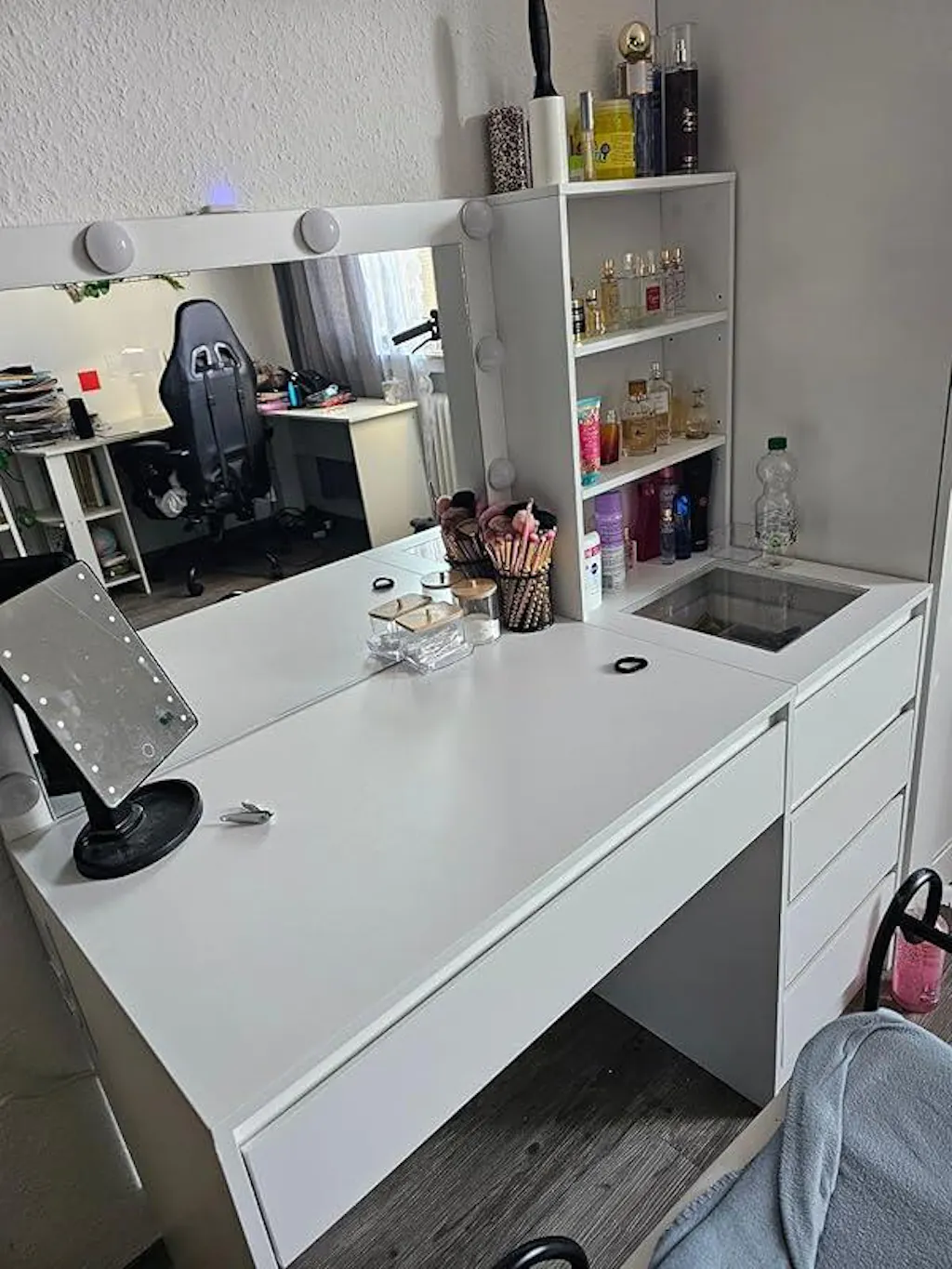 Viel Stauraum Der Schminktisch bietet 3 offene Fächer für Lippenstifte, Lidschatten, Nagellack, Hautpflegeprodukte und Parfüm. Zusätzlich gibt es 4 kleinere Schubladen und eine große Schublade für Haartrockner, Lockenstäbe, Schmuck und andere Kosmetika. Alles hat seinen Platz! Großer Spiegel mit Beleuchtung Ausgestattet mit einem großzügigen Spiegel (55 x 70 cm) und 10 dimmbaren Lampen in 3 Lichtfarben (kalt, neutral, warm). Durch langes Drücken des Schalters lässt sich die Helligkeit anpassen. Die Beleuchtung erleichtert die Hautpflege und das Make-up und sorgt für optimale Lichtverhältnisse. Praktische Ladestation Der Schminktisch verfügt über eine integrierte Steckdosenleiste, die es ermöglicht, Ihre Geräte aufzuladen. So können Sie nicht nur Ihr Handy und Tablet, sondern auch Haartrockner und Lockenstäbe verwenden, was die Anwendung schneller und einfacher macht. Individuelle Aufbewahrungslösungen Im großen Schublade befindet sich ein verstellbarer Einteiler, der je nach Größe der Gegenstände angepasst werden kann. So lassen sich Beauty-Produkte, Kosmetika wie Pinsel, Make-up-Schwämme, Sonnenbrillen und Uhren ordentlich verstauen. Die zwei Regale sind in 3 Höhen verstellbar, um Ihre Hautpflegeprodukte optimal unterzubringen. Schublade mit Glasoberfläche für Schmuck Der Schminktisch ist mit einer transparenten Schmuckschublade ausgestattet, in der Ringe, Ohrringe, Halsketten und Armbänder sicher aufbewahrt werden können. Die verstärkte Glasoberfläche ist nicht nur ästhetisch ansprechend, sondern ermöglicht auch einen ständigen Blick auf Ihren Lieblingsschmuck. Lieferung und Montage Der Schminktisch wird in zwei Paketen geliefert, die möglicherweise zu unterschiedlichen Zeiten ankommen. Bitte warten Sie mit der Montage, bis Sie beide Pakete erhalten haben. Sollten Sie einen beschädigten Schminktisch oder fehlende Teile erhalten, zögern Sie nicht, uns zu kontaktieren. Wir sind jederzeit für Sie da!
