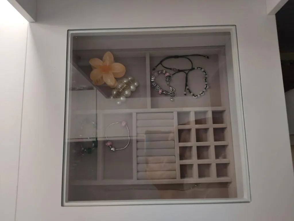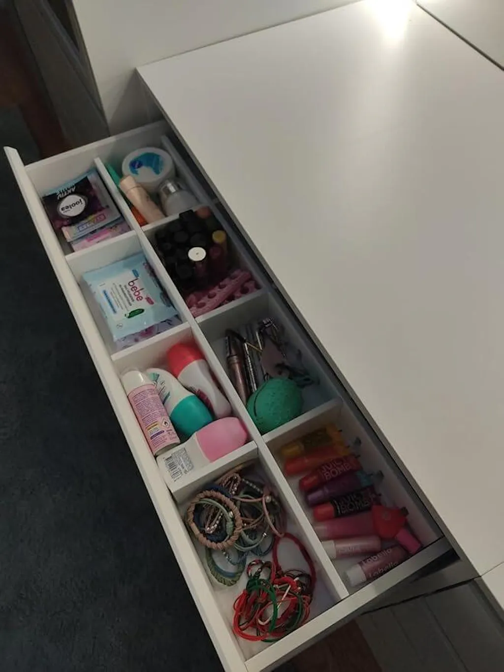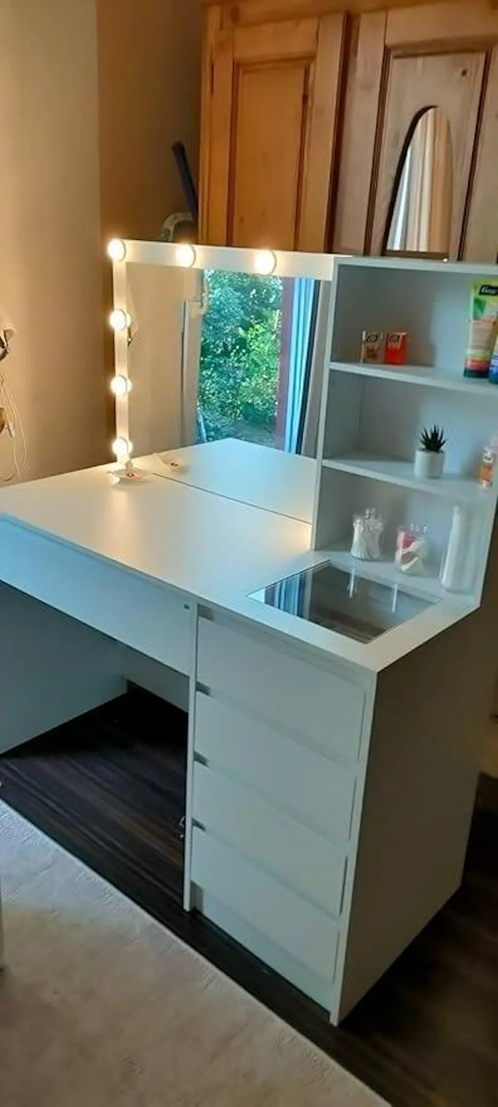 Viel Stauraum Der Schminktisch bietet 3 offene Fächer für Lippenstifte, Lidschatten, Nagellack, Hautpflegeprodukte und Parfüm. Zusätzlich gibt es 4 kleinere Schubladen und eine große Schublade für Haartrockner, Lockenstäbe, Schmuck und andere Kosmetika. Alles hat seinen Platz! Großer Spiegel mit Beleuchtung Ausgestattet mit einem großzügigen Spiegel (55 x 70 cm) und 10 dimmbaren Lampen in 3 Lichtfarben (kalt, neutral, warm). Durch langes Drücken des Schalters lässt sich die Helligkeit anpassen. Die Beleuchtung erleichtert die Hautpflege und das Make-up und sorgt für optimale Lichtverhältnisse. Praktische Ladestation Der Schminktisch verfügt über eine integrierte Steckdosenleiste, die es ermöglicht, Ihre Geräte aufzuladen. So können Sie nicht nur Ihr Handy und Tablet, sondern auch Haartrockner und Lockenstäbe verwenden, was die Anwendung schneller und einfacher macht. Individuelle Aufbewahrungslösungen Im großen Schublade befindet sich ein verstellbarer Einteiler, der je nach Größe der Gegenstände angepasst werden kann. So lassen sich Beauty-Produkte, Kosmetika wie Pinsel, Make-up-Schwämme, Sonnenbrillen und Uhren ordentlich verstauen. Die zwei Regale sind in 3 Höhen verstellbar, um Ihre Hautpflegeprodukte optimal unterzubringen. Schublade mit Glasoberfläche für Schmuck Der Schminktisch ist mit einer transparenten Schmuckschublade ausgestattet, in der Ringe, Ohrringe, Halsketten und Armbänder sicher aufbewahrt werden können. Die verstärkte Glasoberfläche ist nicht nur ästhetisch ansprechend, sondern ermöglicht auch einen ständigen Blick auf Ihren Lieblingsschmuck. Lieferung und Montage Der Schminktisch wird in zwei Paketen geliefert, die möglicherweise zu unterschiedlichen Zeiten ankommen. Bitte warten Sie mit der Montage, bis Sie beide Pakete erhalten haben. Sollten Sie einen beschädigten Schminktisch oder fehlende Teile erhalten, zögern Sie nicht, uns zu kontaktieren. Wir sind jederzeit für Sie da!