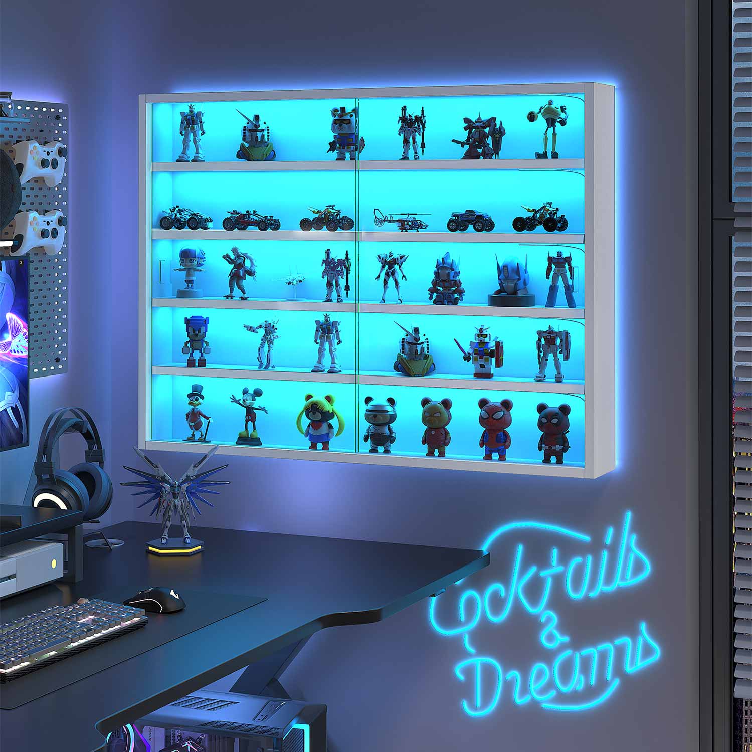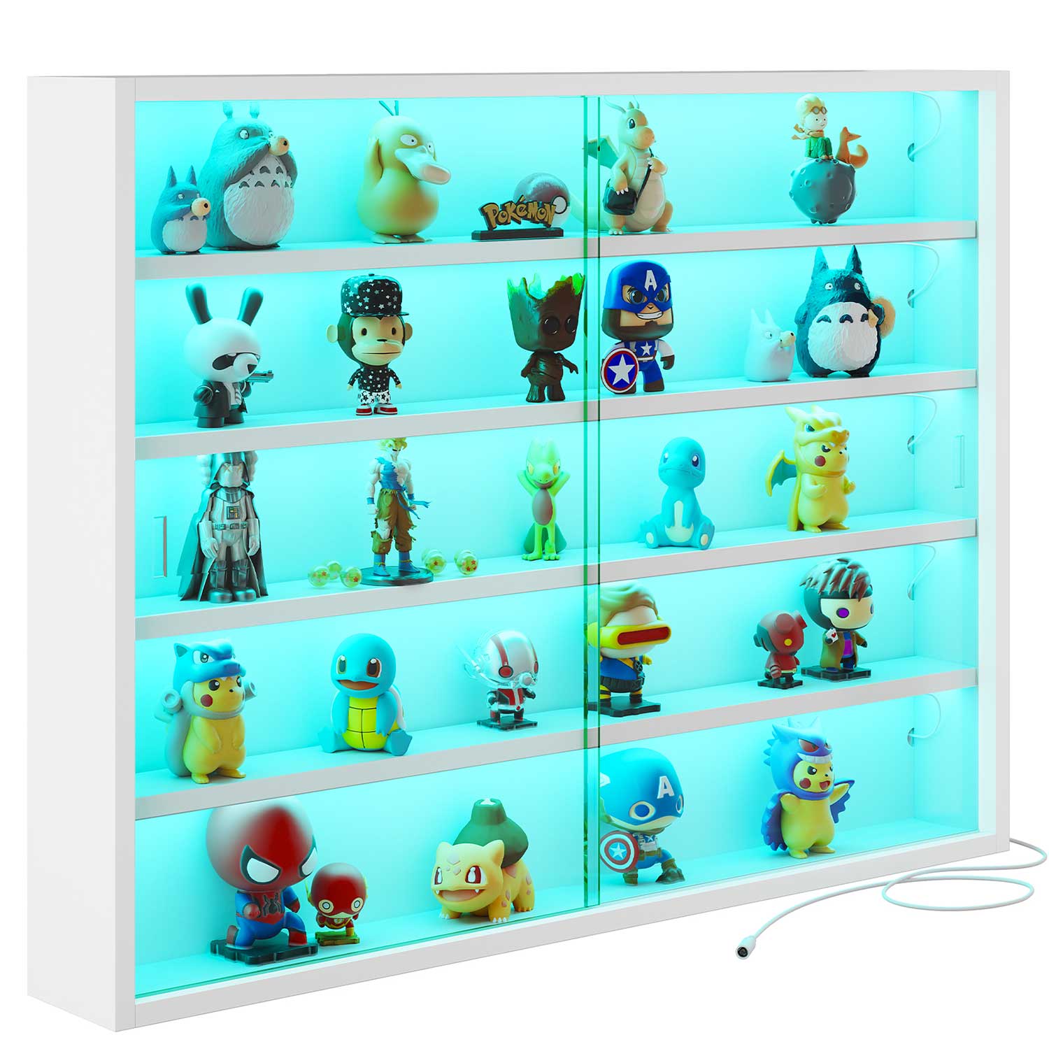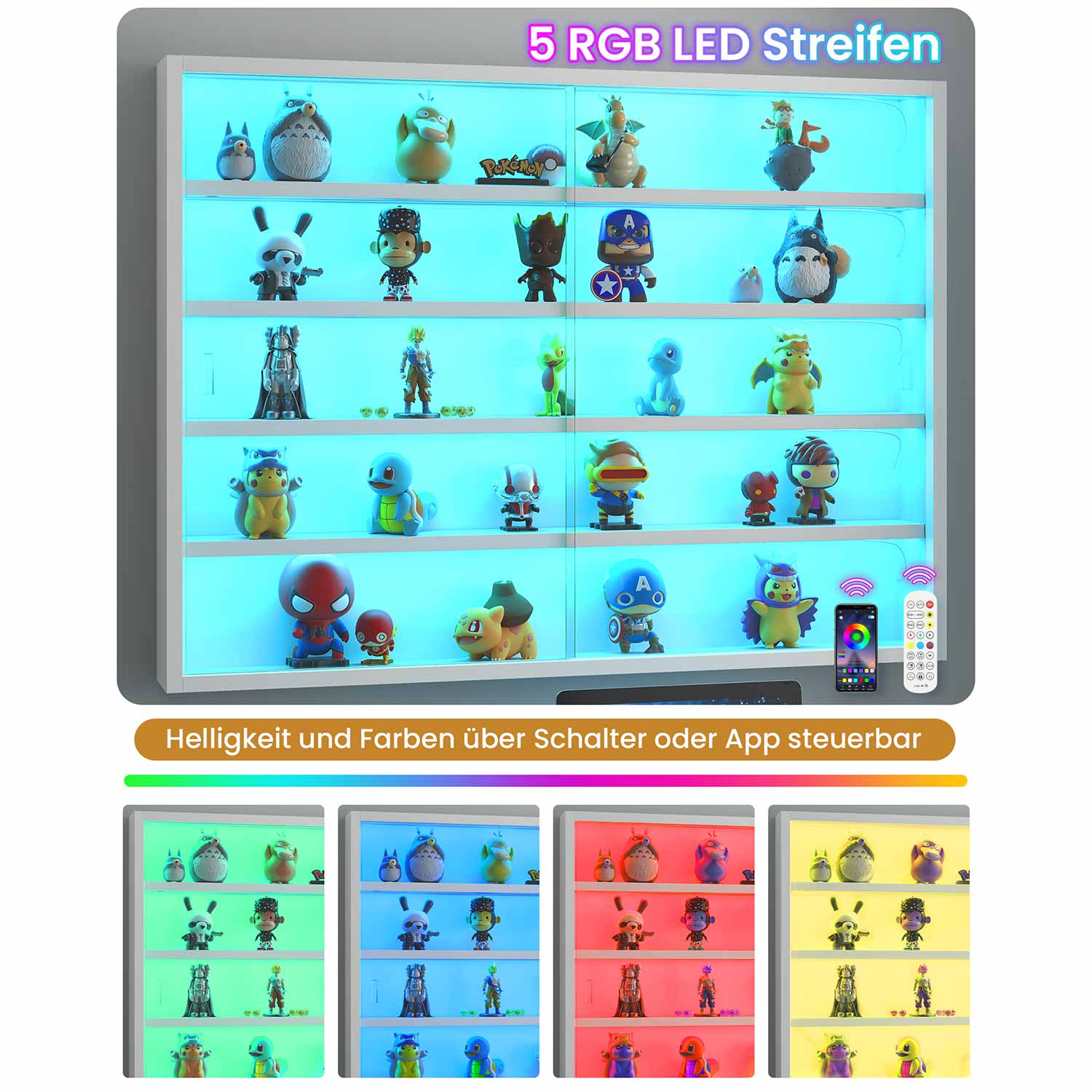 Großzügiger Stauraum Die Glasvitrine mit LED-Beleuchtung ist mit 5 Fächern(80 B x 6,5 T x 10 H cm) entworfen und bietet genügend Platz für Ihre Figuren, Modellautos, Miniaturen, Nagellack und andere schöne Sammlerstücke, so müssen sich Ihre Sammlerstücke nicht in der Ecke stapeln. Jede schöne und ruhige Sammlung findet in der Hängevitrine ihren Platz und erzählt ihre eigene Geschichte Dimmbare LED-Streifen Kurzes Drücken zum Einstellen der Lichtfaben oder Sprachsteuerung. Langes Drücken zum Ausschalten der Beleuchtung.Jede Ablage verfügt über eine LED-Beleuchtung mit über 60.000 Farben. Die Helligkeit und Farben können durch Schalter, Fernbedienung und APP gesteuert werden. Wählen Sie eine gewünschte Farbe, um einen idealen Raum für Ihre Sammlungen zu schaffen und tauchen Sie mit Ihren Sammlungen fröhlich und entspannt in eine fantastische Welt ein Stabil und Schön Bei der Montage sollte zuerst die Schienenplatte an der Wand befestigt werden, und dann rasten Sie die Kerbe auf der Rückseite der Sammlervitrine in die Schienenplatte ein, so können Sie die langlebige wandmontierte Wohnzimmervitrine jederzeit abnehmen und wieder installieren. Sie können die Glasvitrine auch auf andere Schränke stellen, so dass die Wandvitrine von dem darunter stehenden Schrank gestützt wird und so zusätzliche Stabilität erhält Schiebetüren aus gehärtetem Glas Das hängende Wandregal besteht aus hochwertiger MDF-Platte und 2 soliden Glastüren mit ausgeschnittenen Griffen, die leicht zu öffnen und staubdicht sind. Die Kombination aus 5 LED-Streifen und Glastüren verleiht Ihrem Raum einen schicken und stilvollen Touch, bietet visuelles Vergnügen und macht die Sammlervitrine zum Blickfang in Ihrer Wohnung Einfache Montage und Kundenservice Mithilfe der gekennzeichneten Teile, der mitgeschickten Werkzeuge und der ausführlichen Anleitung ist die Montage der Glasvitrine einfach. Falls Sie ein beschädigtes Hängeregal erhalten oder Zubehör fehlt, zögern Sie bitte nicht, uns zu kontaktieren. Wir stehen Ihnen jederzeit zur Verfügung