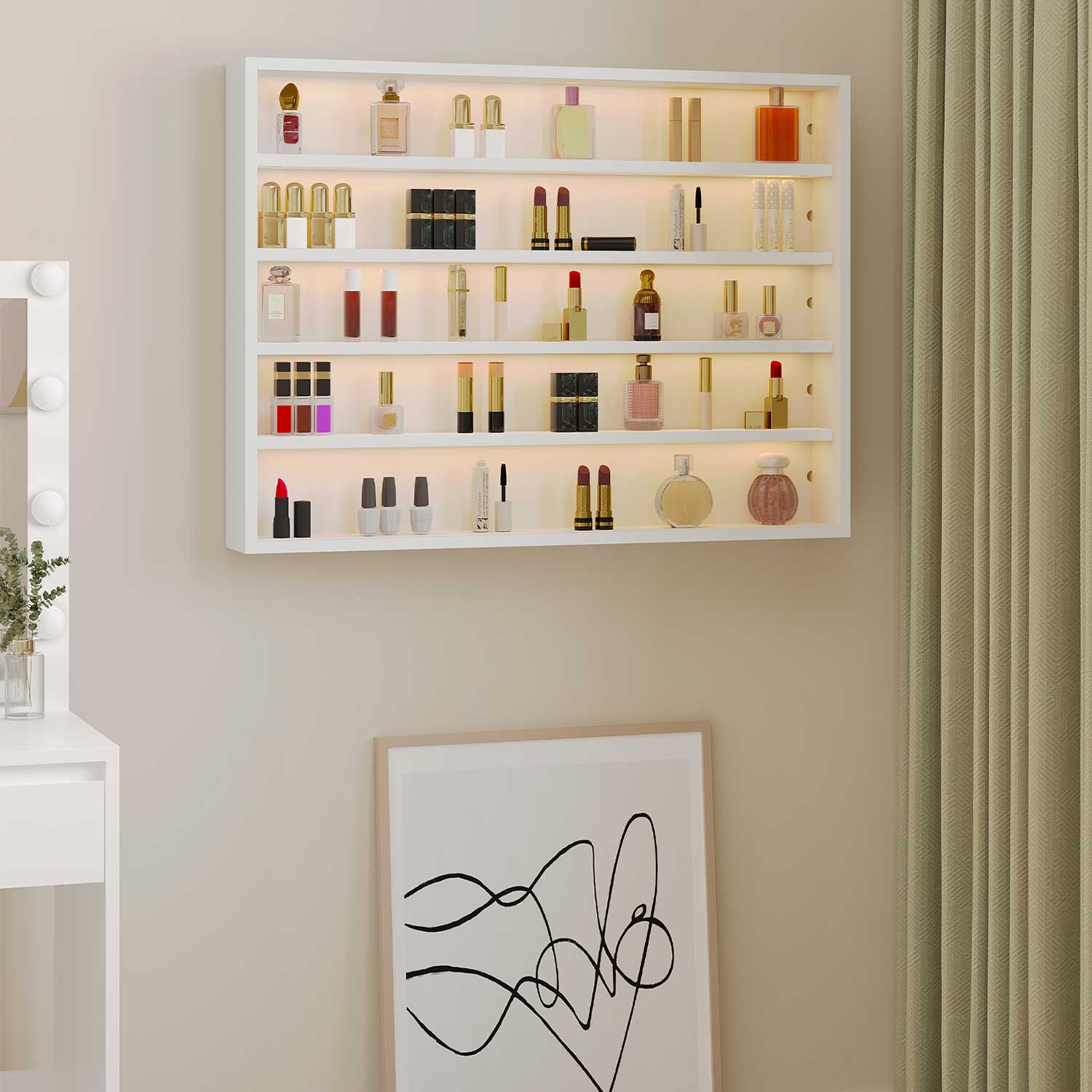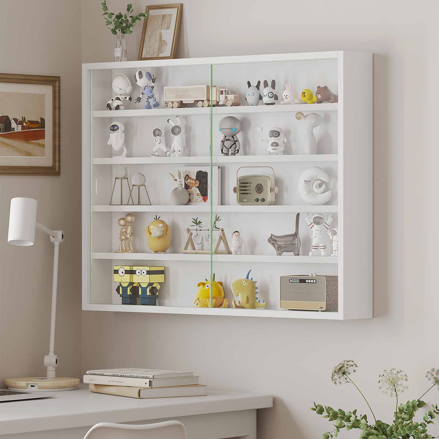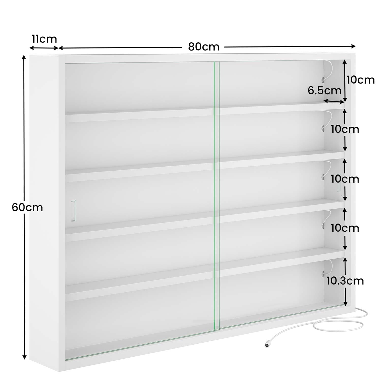 Großzügiger Stauraum Die Glasvitrine mit LED-Beleuchtung ist mit 5 Fächern(80 B x 6,5 T x 10 H cm) entworfen und bietet genügend Platz für Ihre Figuren, Modellautos, Miniaturen, Nagellack und andere schöne Sammlerstücke, so müssen sich Ihre Sammlerstücke nicht in der Ecke stapeln. Jede schöne und ruhige Sammlung findet in der Hängevitrine ihren Platz und erzählt ihre eigene Geschichte Dimmbare LED-Streifen Kurzes Drücken zum Einstellen der Lichtfaben oder Sprachsteuerung. Langes Drücken zum Ausschalten der Beleuchtung.Jede Ablage verfügt über eine LED-Beleuchtung mit über 60.000 Farben. Die Helligkeit und Farben können durch Schalter, Fernbedienung und APP gesteuert werden. Wählen Sie eine gewünschte Farbe, um einen idealen Raum für Ihre Sammlungen zu schaffen und tauchen Sie mit Ihren Sammlungen fröhlich und entspannt in eine fantastische Welt ein Stabil und Schön Bei der Montage sollte zuerst die Schienenplatte an der Wand befestigt werden, und dann rasten Sie die Kerbe auf der Rückseite der Sammlervitrine in die Schienenplatte ein, so können Sie die langlebige wandmontierte Wohnzimmervitrine jederzeit abnehmen und wieder installieren. Sie können die Glasvitrine auch auf andere Schränke stellen, so dass die Wandvitrine von dem darunter stehenden Schrank gestützt wird und so zusätzliche Stabilität erhält Schiebetüren aus gehärtetem Glas Das hängende Wandregal besteht aus hochwertiger MDF-Platte und 2 soliden Glastüren mit ausgeschnittenen Griffen, die leicht zu öffnen und staubdicht sind. Die Kombination aus 5 LED-Streifen und Glastüren verleiht Ihrem Raum einen schicken und stilvollen Touch, bietet visuelles Vergnügen und macht die Sammlervitrine zum Blickfang in Ihrer Wohnung Einfache Montage und Kundenservice Mithilfe der gekennzeichneten Teile, der mitgeschickten Werkzeuge und der ausführlichen Anleitung ist die Montage der Glasvitrine einfach. Falls Sie ein beschädigtes Hängeregal erhalten oder Zubehör fehlt, zögern Sie bitte nicht, uns zu kontaktieren. Wir stehen Ihnen jederzeit zur Verfügung