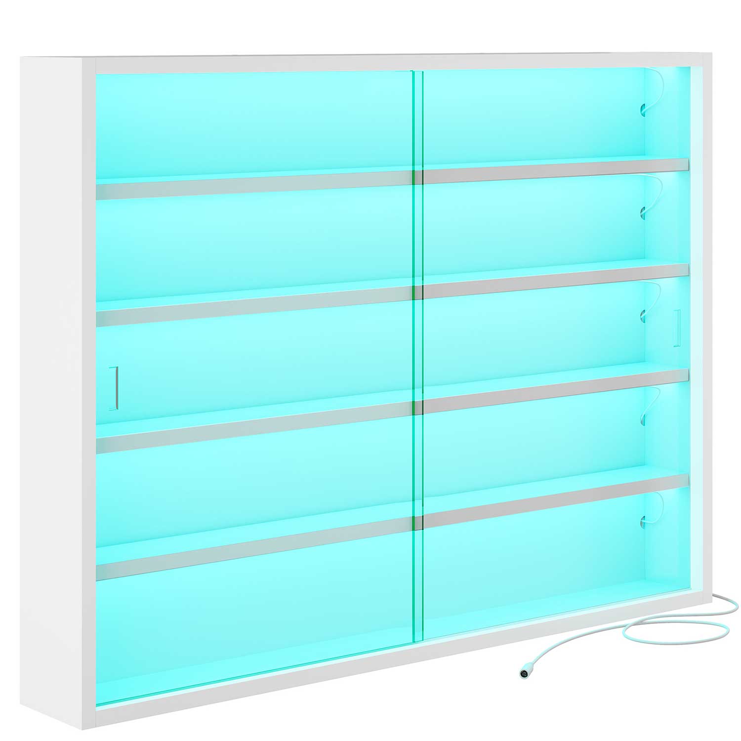 Präsentieren Sie Ihre Lieblingsstücke mit dieser wandmontierten Wohnzimmervitrine mit Doppelglastüren, 5 Regalen und LED-Beleuchtung.